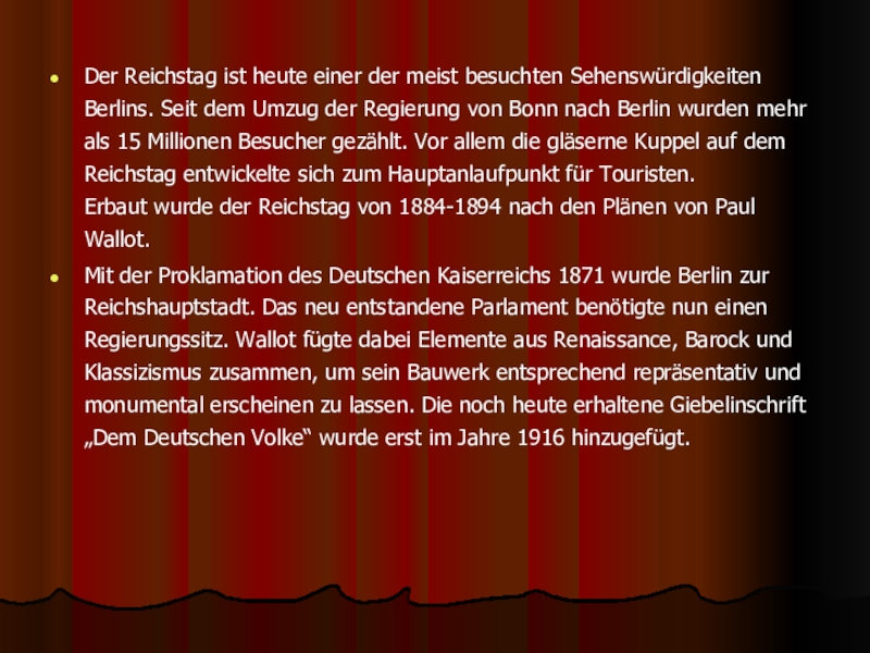 Mit der Proklamation des Deutschen Kaiserreichs 1871 wurde Berlin zur Reichshauptstadt. Das neu entstandene Parlament benötigte nun einen Regierungssitz. Wallot fügte dabei Elemente aus Renaissance, Barock und Klassizismus zusammen, um sein Bauwerk entsprechend repräsentativ und monumental erscheinen zu lassen. Die noch heute erhaltene Giebelinschrift „Dem Deutschen Volke“ wurde erst im Jahre 1916 hinzugefügt.