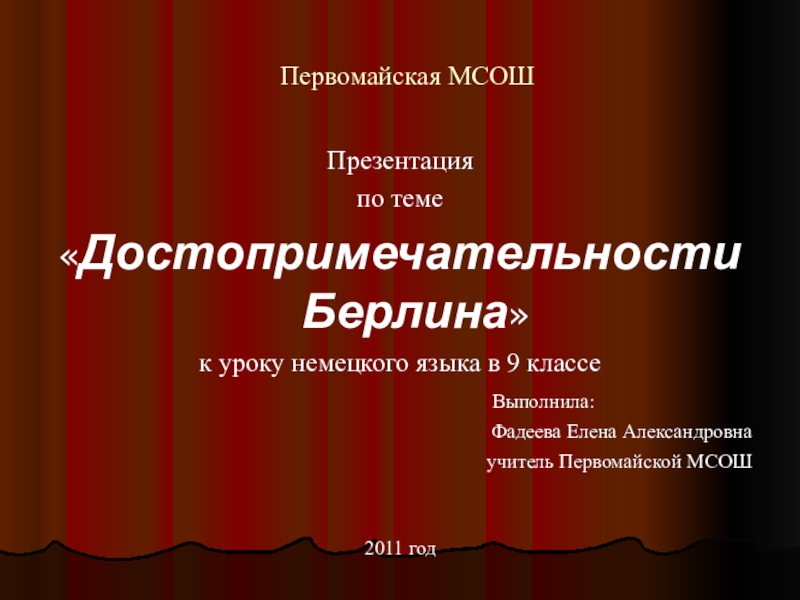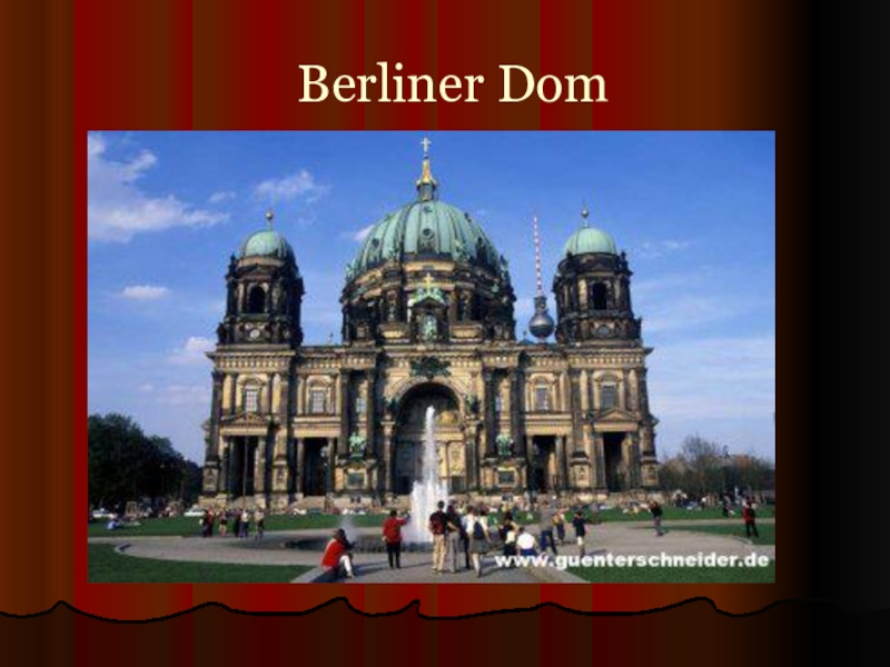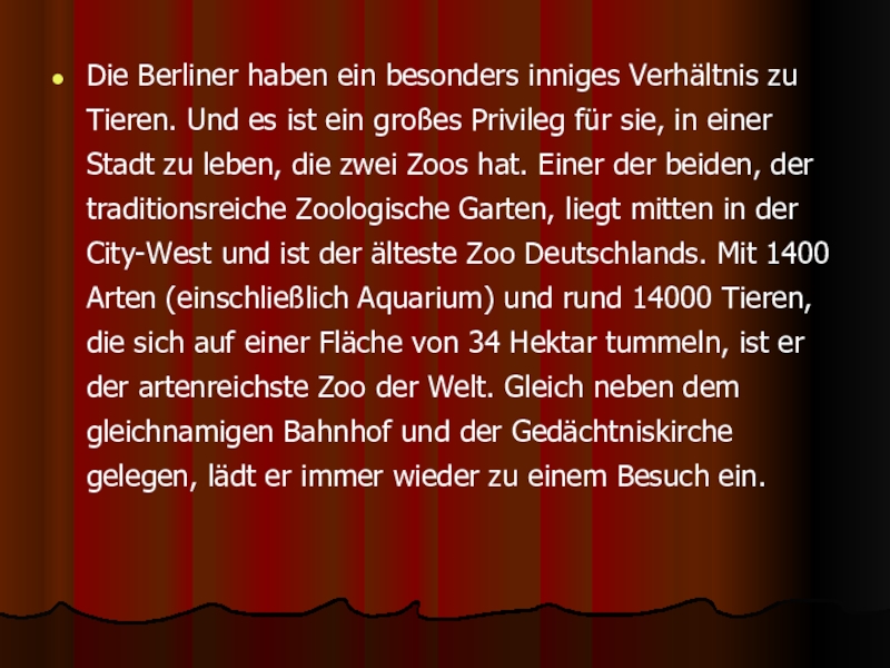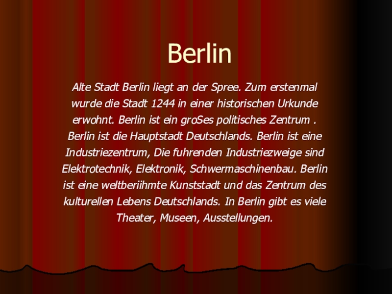 Stadt 1244 in einer historischen Urkunde erwоhnt. Berlin ist ein groSes politisches Zentrum . Berlin ist die Hauptstadt Deutschlands. Berlin ist eine Industriezentrum, Die fuhrenden Industriezweige sind Elektrotechnik, Elektronik, Schwermaschinenbau. Berlin ist eine weltberiihmte Kunststadt und das Zentrum des kulturellen Lebens Deutschlands. In Berlin gibt es viele Theater, Museen, Ausstellungen.