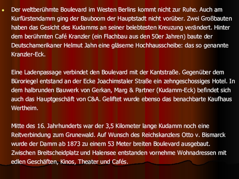 Слайд 14Der weltberühmte Boulevard im Westen Berlins kommt nicht zur Ruhe. Auch