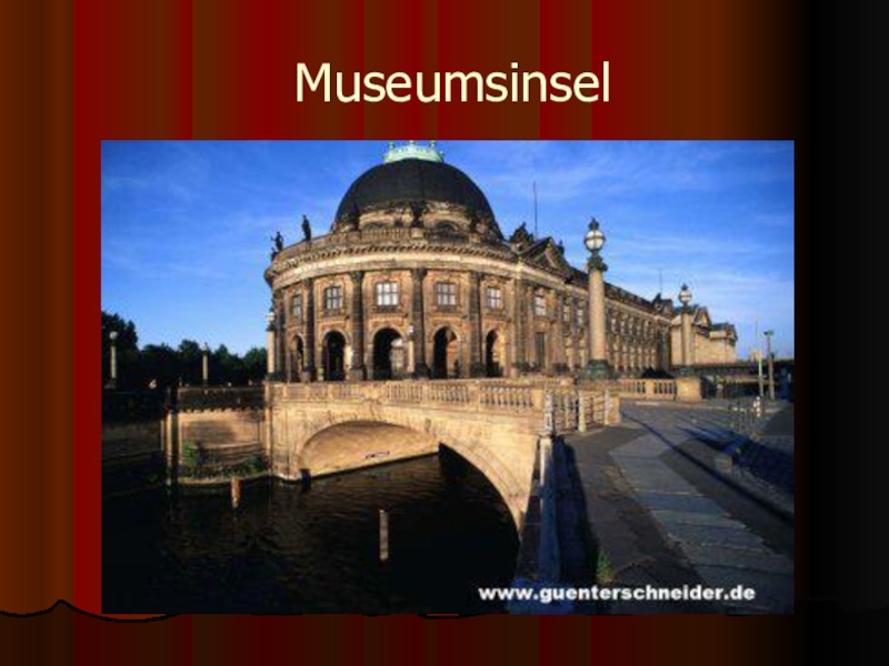 Das Reiterstandbild auf der Freitreppe stellt König Friedrich Wilhelm IV. dar, der die Idee zur Museumsinsel hatte. In der Alten Nationalgalerie sind Werke der französischen Impressionisten (Manet, Monet, Renoir) zu sehen, daneben Gemälde der Romantik von Caspar David Friedrich und Karl Friedrich Schinkel. An der Nordspitze der Insel liegt das Bode-Museum, 1898–1904 von Ernst von Ihne für Gemälde und Skulpturen erbaut. Es wurde 2006 feierlich wiedereröffnet.