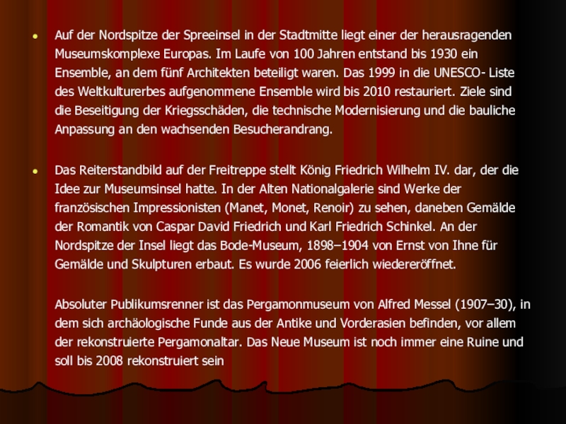 herausragenden Museumskomplexe Europas. Im Laufe von 100 Jahren entstand bis 1930 ein Ensemble, an dem fünf Architekten beteiligt waren. Das 1999 in die UNESCO- Liste des Weltkulturerbes aufgenommene Ensemble wird bis 2010 restauriert. Ziele sind die Beseitigung der Kriegsschäden, die technische Modernisierung und die bauliche Anpassung an den wachsenden Besucherandrang.