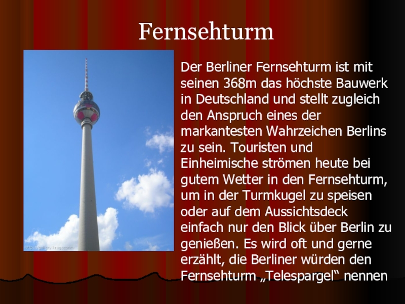 Deutschland und stellt zugleich den Anspruch eines der markantesten Wahrzeichen Berlins zu sein. Touristen und Einheimische strömen heute bei gutem Wetter in den Fernsehturm, um in der Turmkugel zu speisen oder auf dem Aussichtsdeck einfach nur den Blick über Berlin zu genießen. Es wird oft und gerne erzählt, die Berliner würden den Fernsehturm „Telespargel“ nennen