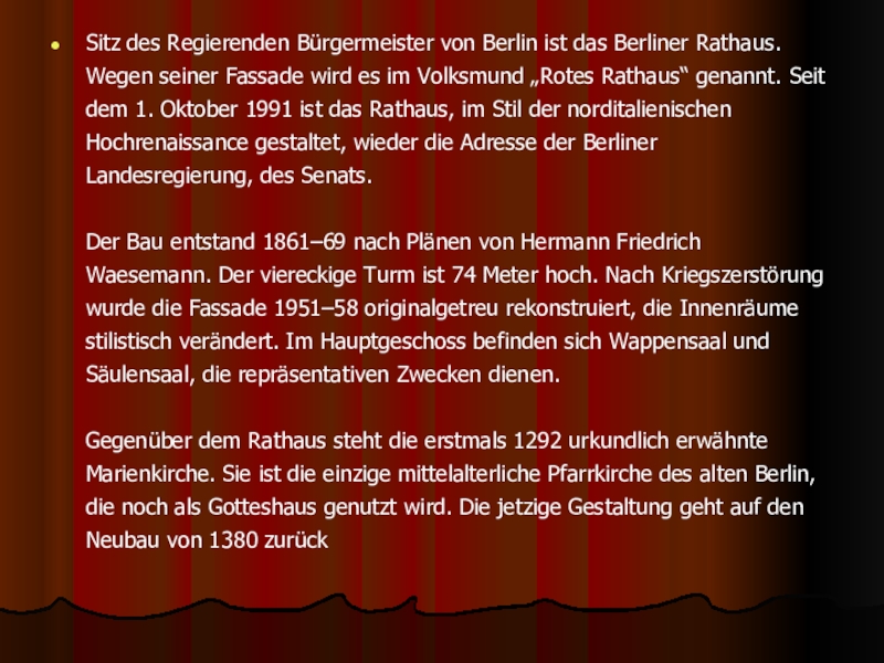 Слайд 10Sitz des Regierenden Bürgermeister von Berlin ist das Berliner Rathaus. Wegen
