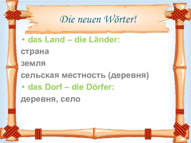 Die neuen Wörter!das Land – die Länder:страназемлясельская местность (деревня)das Dorf – die Dörfer:деревня, село