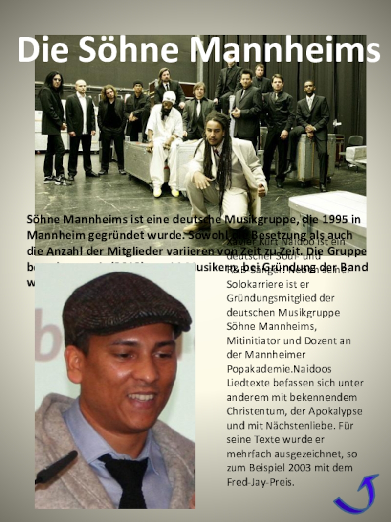 Xavier Kurt Naidoo ist ein deutscher Soul- und R&B-Sänger. Neben seiner Solokarriere ist er Gründungsmitglied der deutschen Musikgruppe Söhne Mannheims, Mitinitiator und Dozent an der Mannheimer Popakademie.Naidoos Liedtexte befassen sich unter anderem mit bekennendem Christentum, der Apokalypse und mit Nächstenliebe. Für seine Texte wurde er mehrfach ausgezeichnet, so zum Beispiel 2003 mit dem Fred-Jay-Preis.