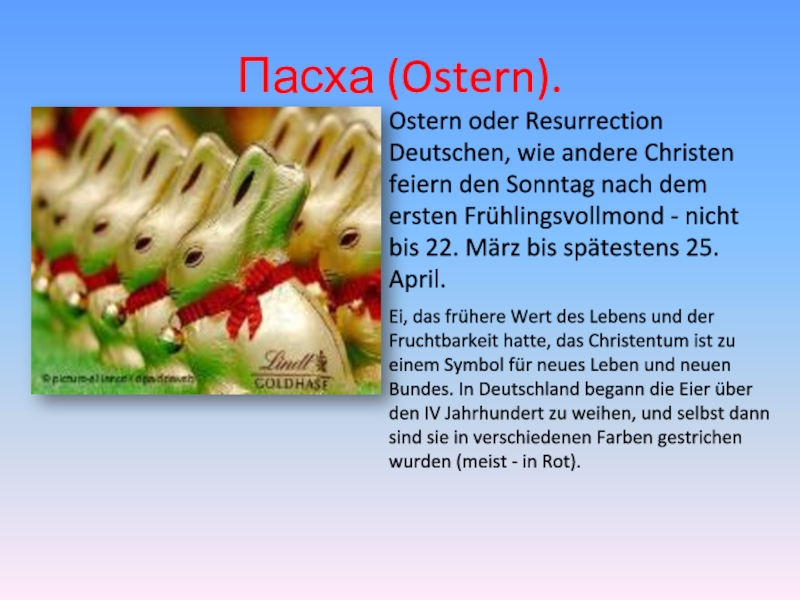Ei, das frühere Wert des Lebens und der Fruchtbarkeit hatte, das Christentum ist zu einem Symbol für neues Leben und neuen Bundes. In Deutschland begann die Eier über den IV Jahrhundert zu weihen, und selbst dann sind sie in verschiedenen Farben gestrichen wurden (meist - in Rot).