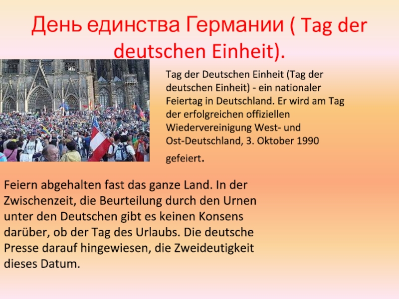Feiern abgehalten fast das ganze Land. In der Zwischenzeit, die Beurteilung durch den Urnen unter den Deutschen gibt es keinen Konsens darüber, ob der Tag des Urlaubs. Die deutsche Presse darauf hingewiesen, die Zweideutigkeit dieses Datum.