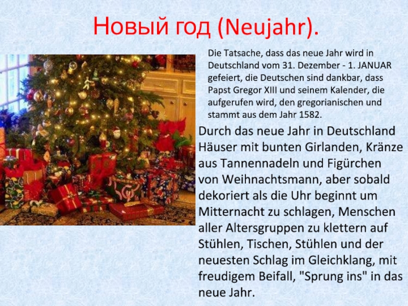Die Tatsache, dass das neue Jahr wird in Deutschland vom 31. Dezember - 1. JANUAR gefeiert, die Deutschen sind dankbar, dass Papst Gregor XIII und seinem Kalender, die aufgerufen wird, den gregorianischen und stammt aus dem Jahr 1582.