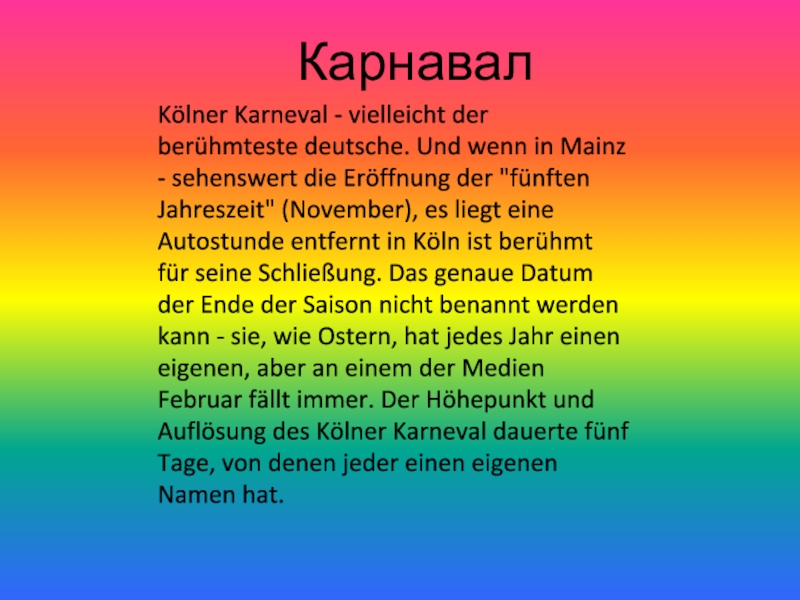 Kölner Karneval - vielleicht der berühmteste deutsche. Und wenn in Mainz - sehenswert die Eröffnung der "fünften Jahreszeit" (November), es liegt eine Autostunde entfernt in Köln ist berühmt für seine Schließung. Das genaue Datum der Ende der Saison nicht benannt werden kann - sie, wie Ostern, hat jedes Jahr einen eigenen, aber an einem der Medien Februar fällt immer. Der Höhepunkt und Auflösung des Kölner Karneval dauerte fünf Tage, von denen jeder einen eigenen Namen hat.