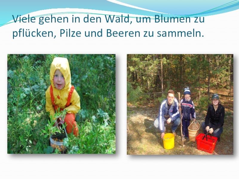 Слайд 15Viele gehen in den Wald, um Blumen zu pflücken, Pilze und