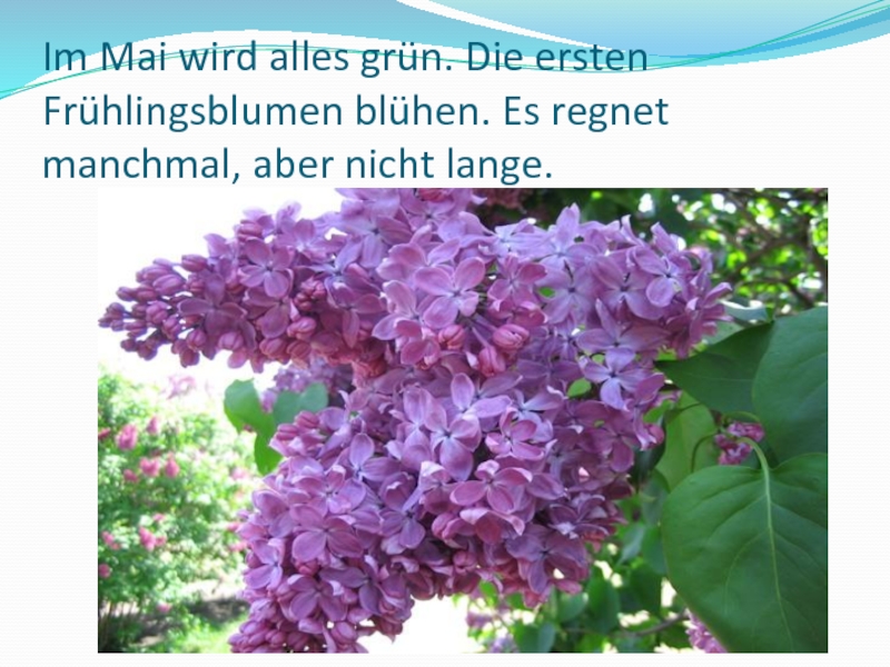 Слайд 9Im Mai wird alles grün. Die ersten Frühlingsblumen blühen. Es regnet