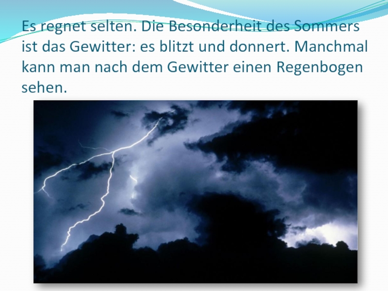 Слайд 13Es regnet selten. Die Besonderheit des Sommers ist das Gewitter: es