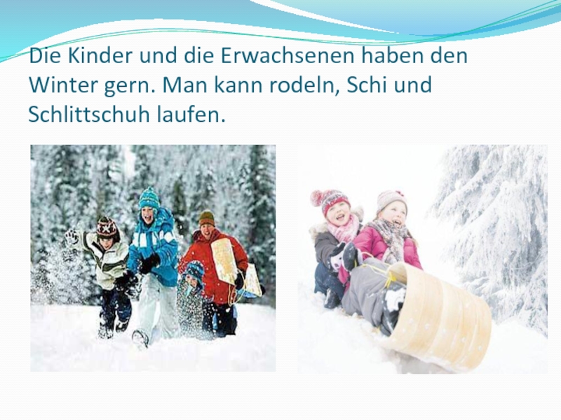 Слайд 6Die Kinder und die Erwachsenen haben den Winter gern. Man kann