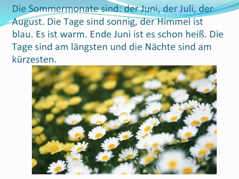 Слайд 12Die Sommermonate sind: der Juni, der Juli, der August. Die Tage