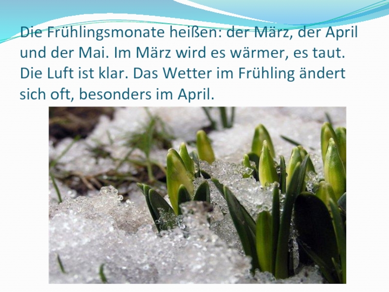 Слайд 8Die Frühlingsmonate heißen: der März, der April und der Mai. Im