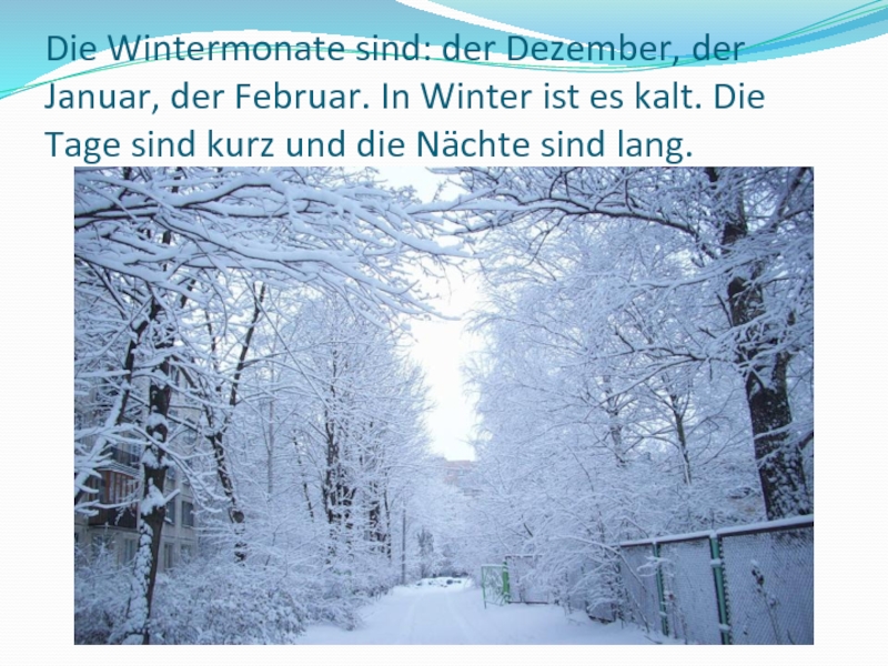 Слайд 4Die Wintermonate sind: der Dezember, der Januar, der Februar. In Winter