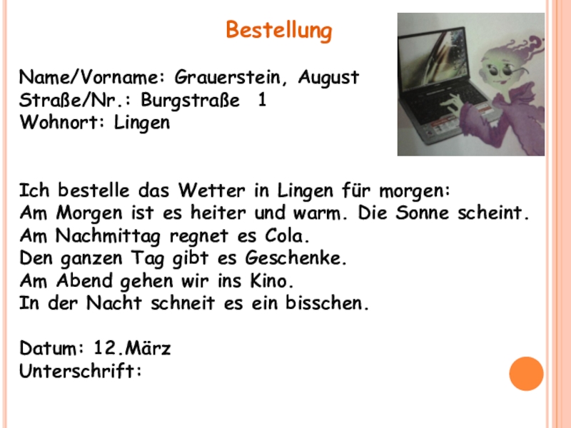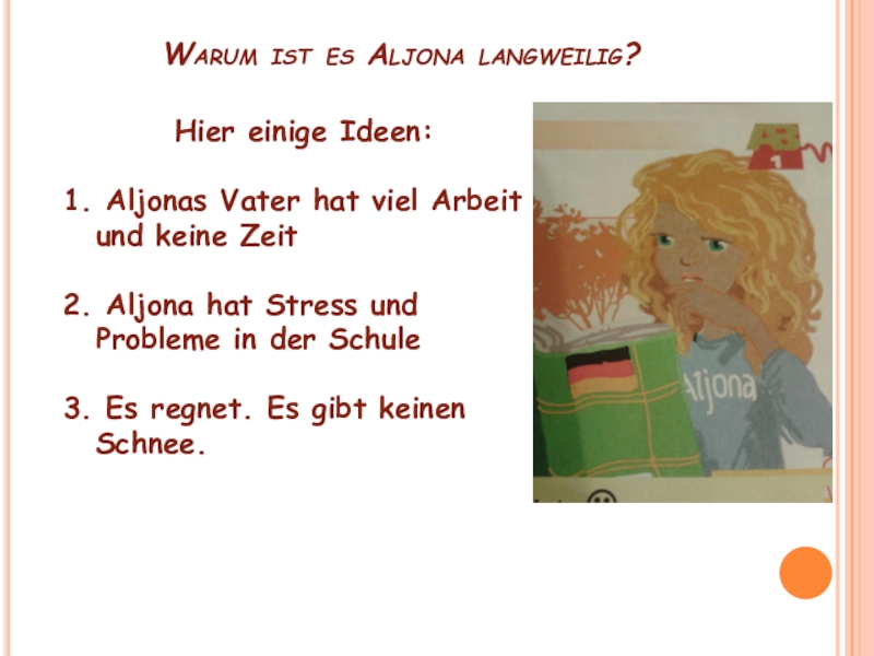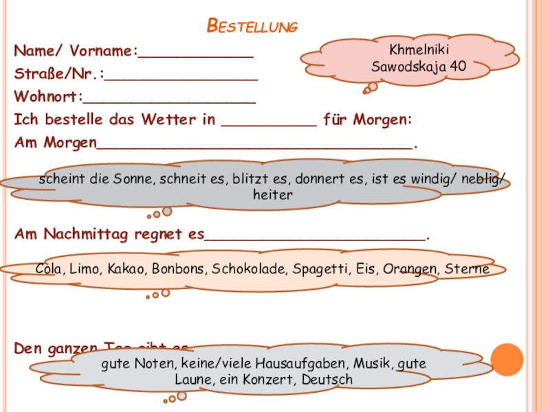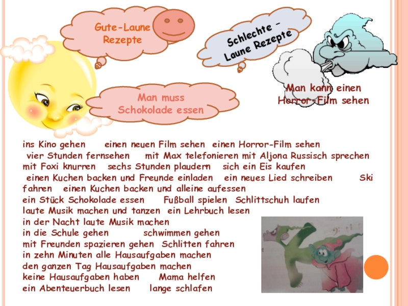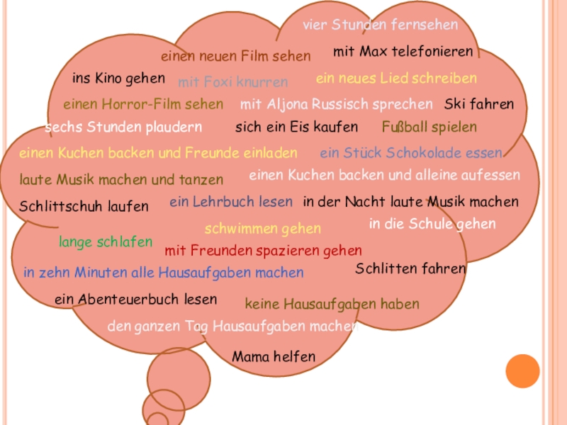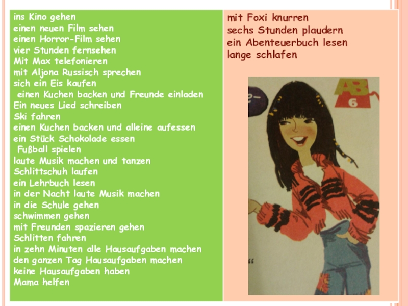 vier Stunden fernsehen mit Max telefonieren mit Aljona Russisch sprechen mit Foxi knurren sechs Stunden plaudern sich ein Eis kaufen