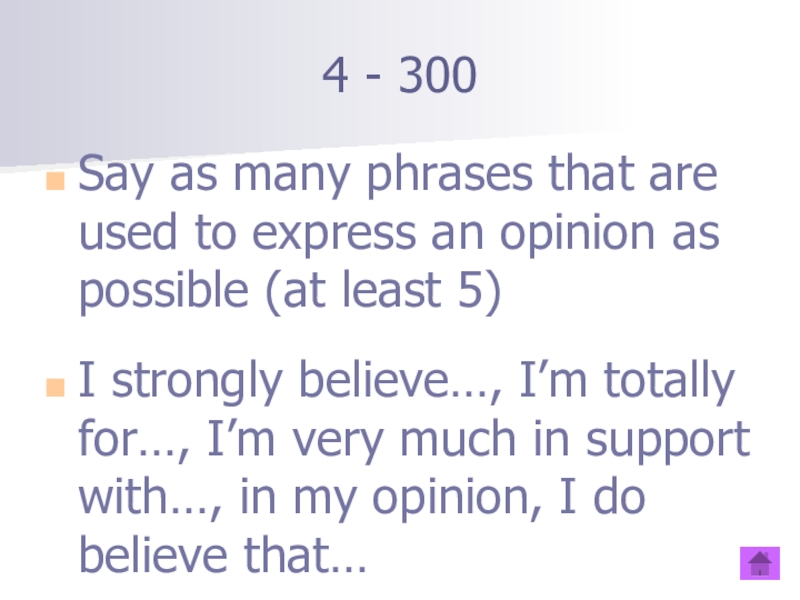I strongly believe…, I’m totally for…, I’m very much in support with…, in my opinion, I do believe that…