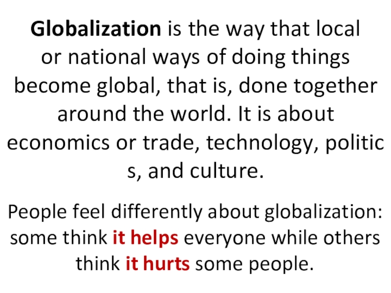 People feel differently about globalization: some think it helps everyone while others think it hurts some people.