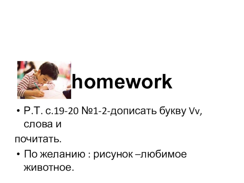 homeworkР.Т. с.19-20 №1-2-дописать букву Vv,слова ипочитать.По желанию : рисунок –любимое животное.