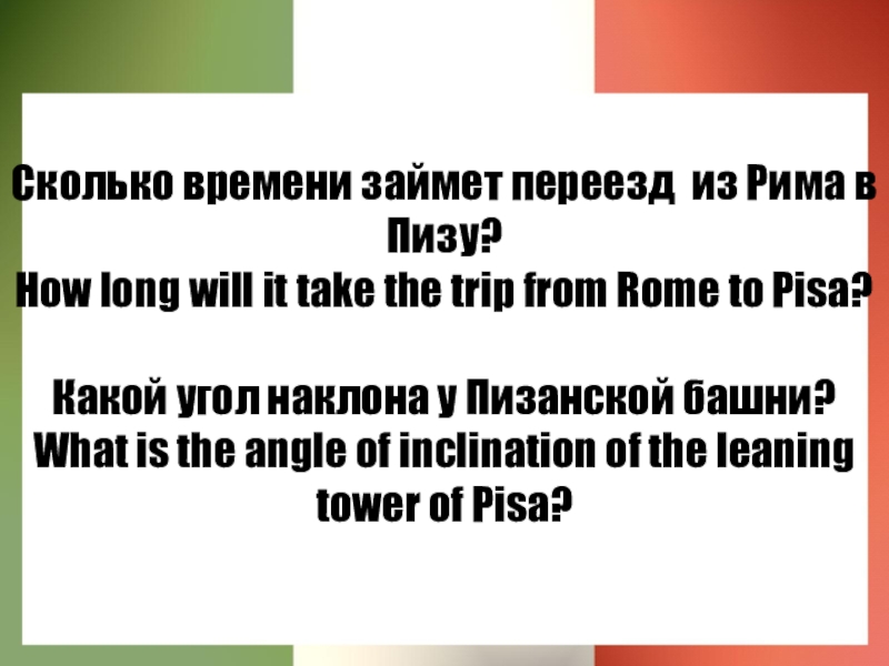 Слайд 8Сколько времени займет переезд из Рима в Пизу? How long will it