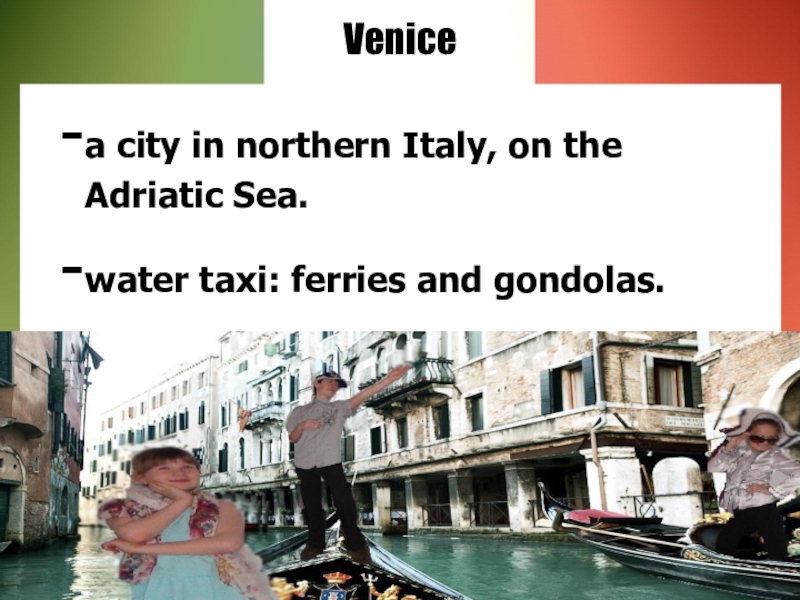 Venicea city in northern Italy, on the Adriatic Sea. water taxi: ferries and gondolas. was the center