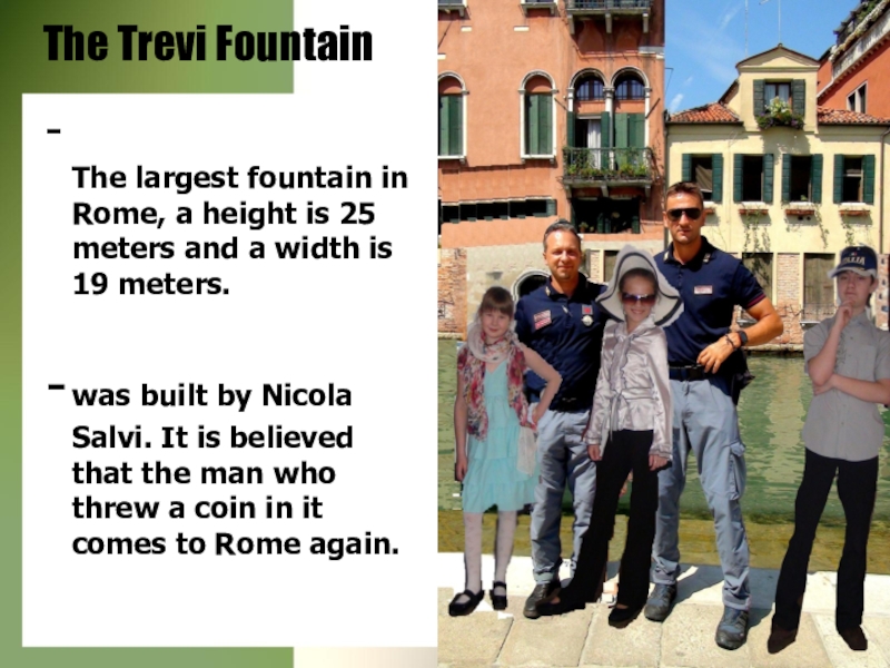 The Trevi Fountain The largest fountain in Rome, a height is 25 meters and a width is
