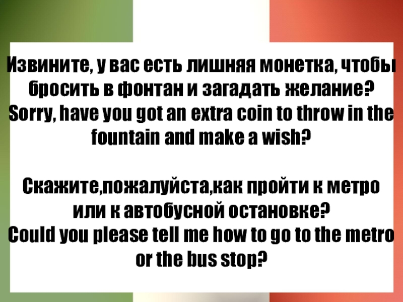 загадать желание? Sorry, have you got an extra coin to throw in the fountain and make a wish? Скажите,пожалуйста,как пройти к метро или к автобусной остановке? Could you please tell me how to go to the metro or the bus stop?