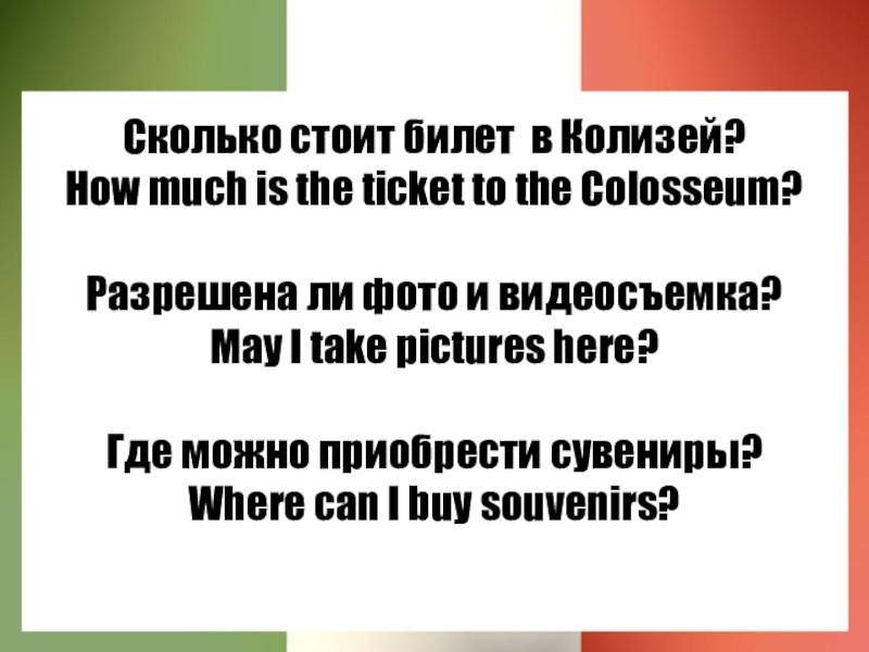 Colosseum? Разрешена ли фото и видеосъемка? May I take pictures here? Где можно приобрести сувениры? Where can I buy souvenirs?