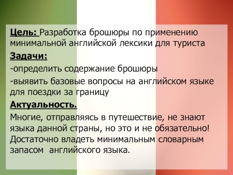 Цель: Разработка брошюры по применению минимальной английской лексики для туристаЗадачи:-определить содержание брошюры-выявить базовые вопросы на английском языке