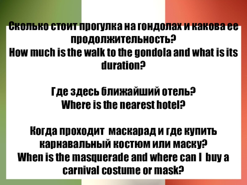 the walk to the gondola and what is its duration? Где здесь ближайший отель? Where is the nearest hotel?   Когда проходит маскарад и где купить карнавальный костюм или маску? When is the masquerade and where can I buy a carnival costume or mask?