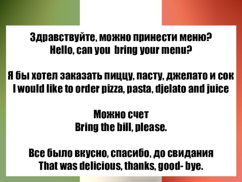 хотел заказать пиццу, пасту, джелато и сок I would like to order pizza, pasta, djelato and juice Можно счет Bring the bill, please. Все было вкусно, спасибо, до свидания That was delicious, thanks, good- bye.