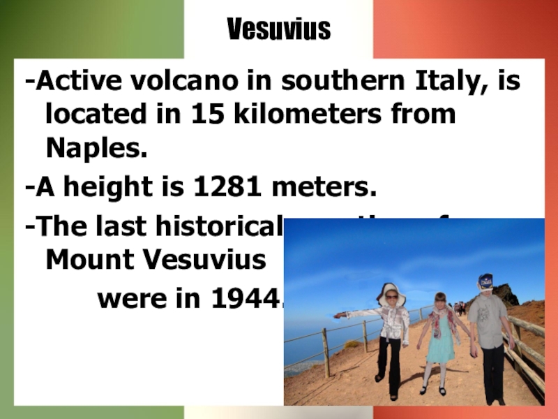 Vesuvius-Active volcano in southern Italy, is located in 15 kilometers from Naples. -A height is 1281 meters.