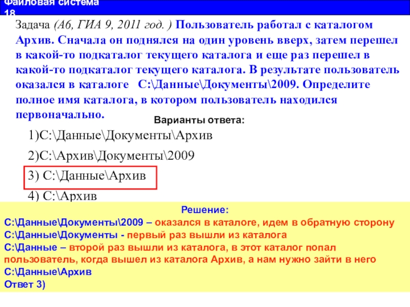 Задача (А6, ГИА 9, 2011 год. ) Пользователь работал с каталогом Архив. Сначала он поднялся на один уровень вверх, затем перешел в какой-то подкаталог текущего каталога и еще раз перешел в какой-то подкаталог текущего каталога. В результате пользователь оказался в каталоге C:\Данные\Документы\2009. Определите полное имя каталога, в котором пользователь находился первоначально.