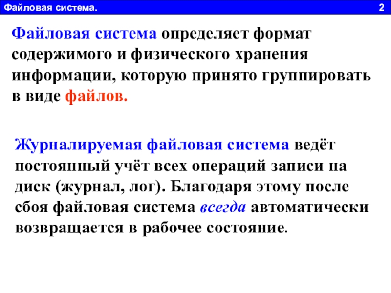 Журналируемая файловая система ведёт постоянный учёт всех операций записи на диск (журнал, лог). Благодаря этому после сбоя файловая система всегда автоматически возвращается в рабочее состояние.
