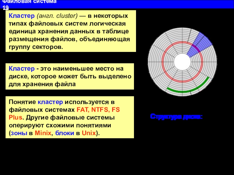 Понятие кластер используется в файловых системах FAT, NTFS, FS Plus. Другие файловые системы оперируют схожими понятиями (зоны в Minix, блоки в Unix).