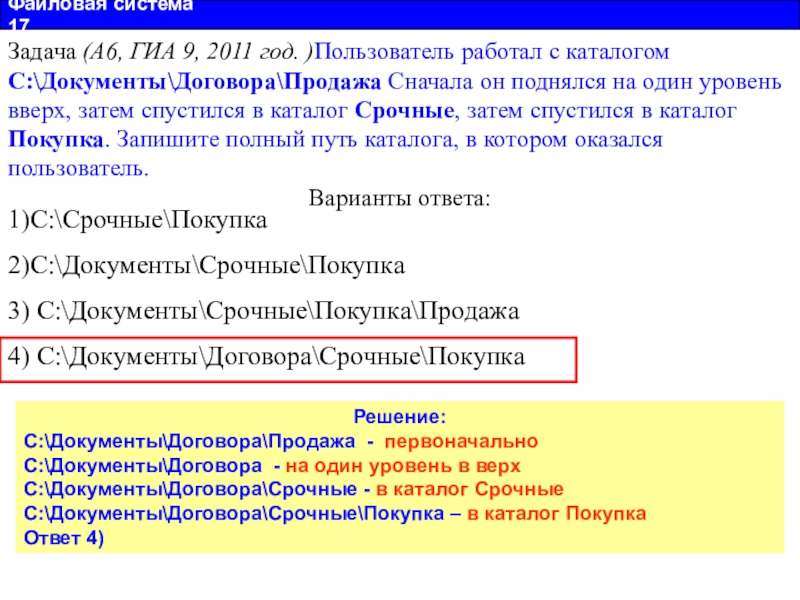 Задача (А6, ГИА 9, 2011 год. )Пользователь работал с каталогом С:\Документы\Договора\Продажа Сначала он поднялся на один уровень вверх, затем спустился в каталог Срочные, затем спустился в каталог Покупка. Запишите полный путь каталога, в котором оказался пользователь.