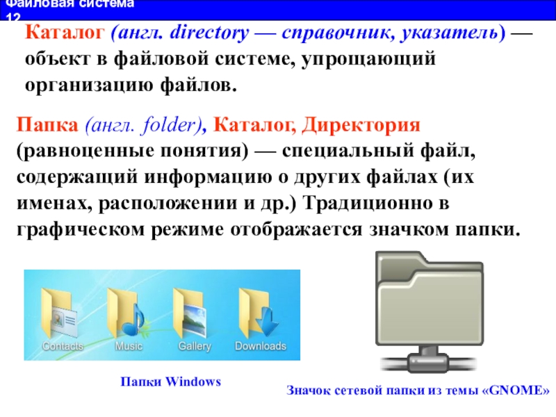 Папка (англ. folder), Каталог, Директория (равноценные понятия) — специальный файл, содержащий информацию о других файлах (их именах, расположении и др.) Традиционно в графическом режиме отображается значком папки.