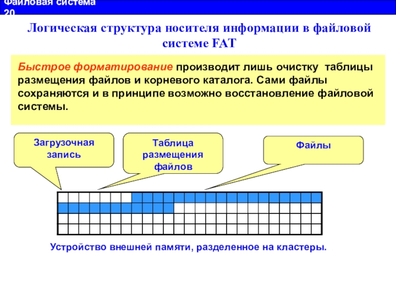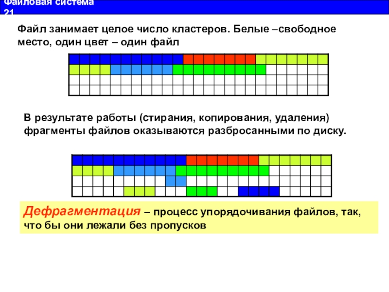 Файл занимает целое число кластеров. Белые –свободное место, один цвет – один файл