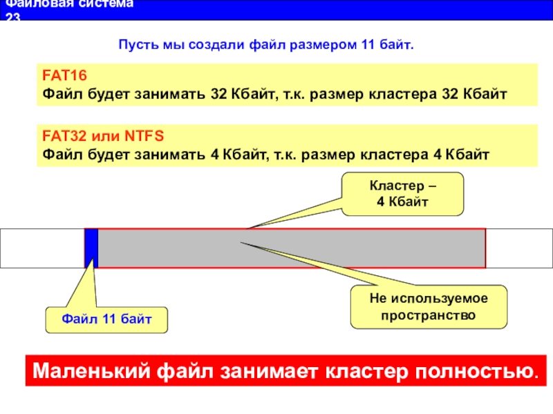 Кластер - это наименьшее место на диске, которое может быть выделено для хранения файла