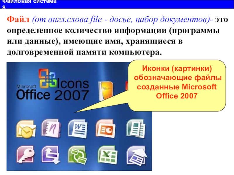 Файл (от англ.слова file - досье, набор документов)- это определенное количество информации (программы или данные), имеющие имя, хранящиеся в долговременной памяти компьютера.