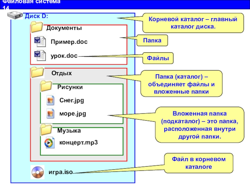 Вложенная папка (подкаталог) – это папка, расположенная внутри другой папки.