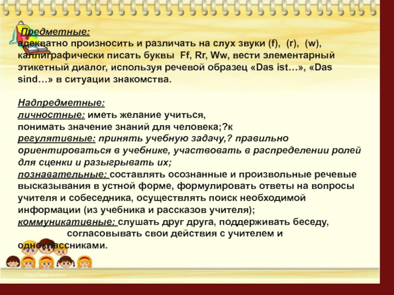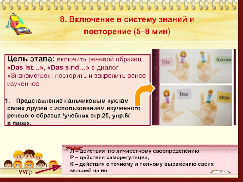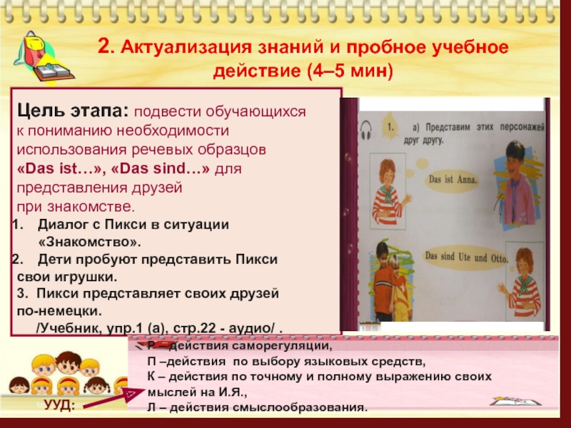 Научить представлять других при знакомстве, используя речевой образец «Das ist…», «Das sind…».