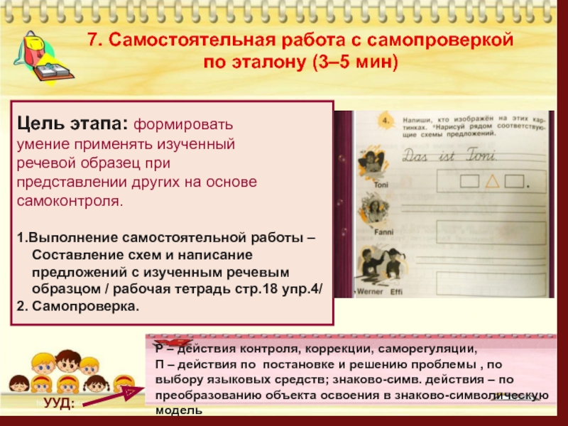 П – действия по постановке и решению проблемы , по выбору языковых средств; знаково-симв. действия – по преобразованию объекта освоения в знаково-символическую модель