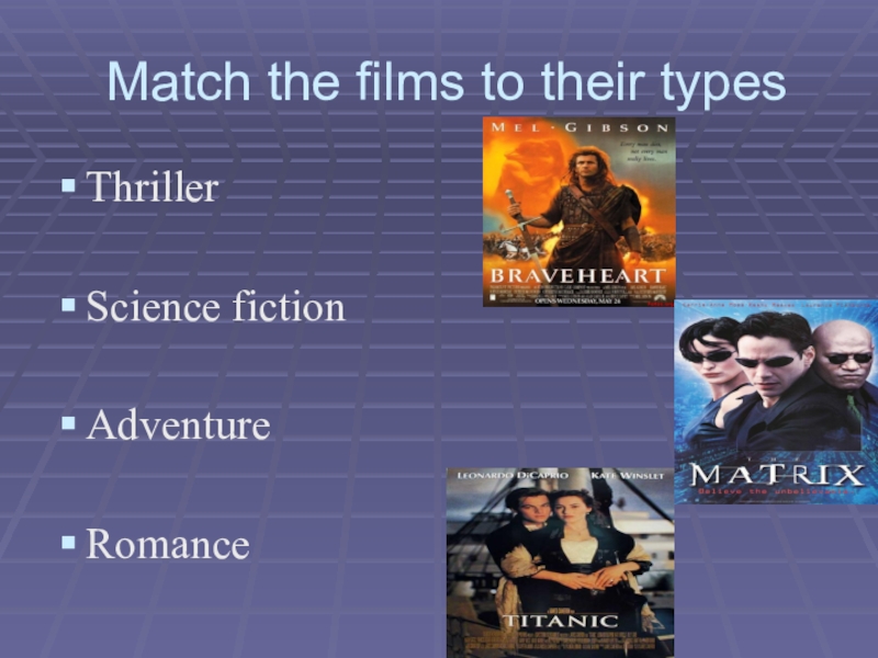 Match the films to their typesThrillerScience fictionAdventureRomance