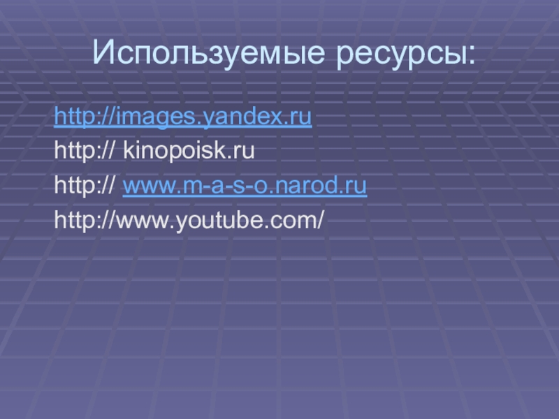 Используемые ресурсы:  http://images.yandex.ru  http:// kinopoisk.ru  http:// www.m-a-s-o.narod.ru  http://www.youtube.com/