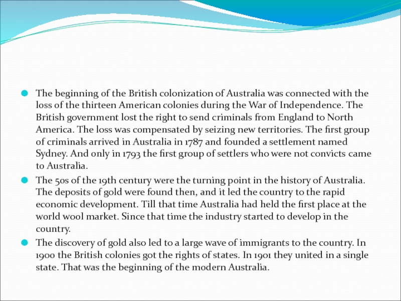 the loss of the thirteen American colonies during the War of Independence. The British government lost the right to send criminals from England to North America. The loss was compensated by seizing new territories. The first group of criminals arrived in Australia in 1787 and founded a settlement named Sydney. And only in 1793 the first group of settlers who were not convicts came to Australia.