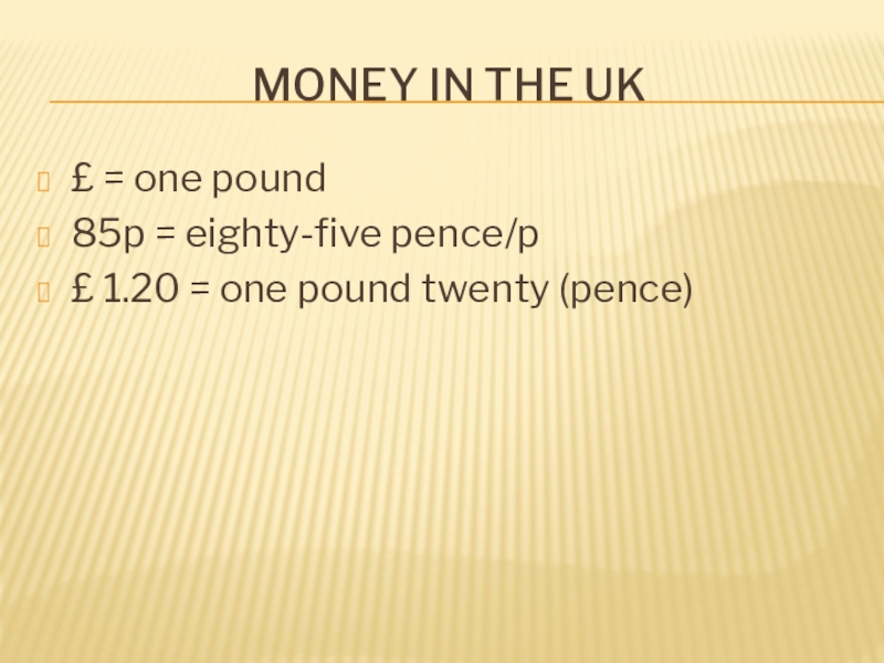Money in the uk£ = one pound85p = eighty-five pence/p£ 1.20 = one pound twenty (pence)
