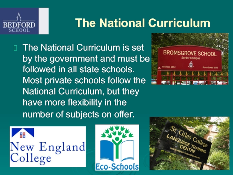 The National Curriculum is set by the government and must be followed in all state schools. Most private schools follow the National Curriculum, but they have more flexibility in the number of subjects on offer.