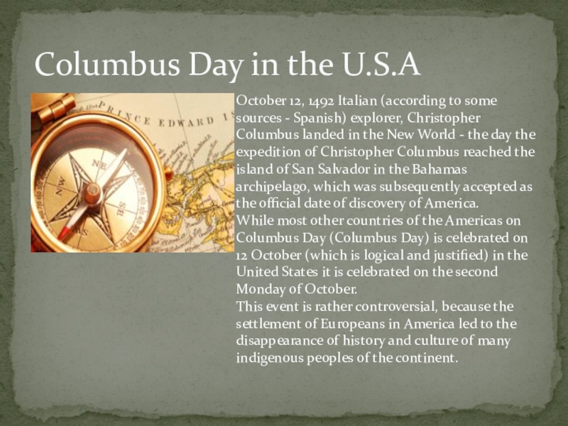 Columbus Day in the U.S.AOctober 12, 1492 Italian (according to some sources - Spanish) explorer, Christopher Columbus